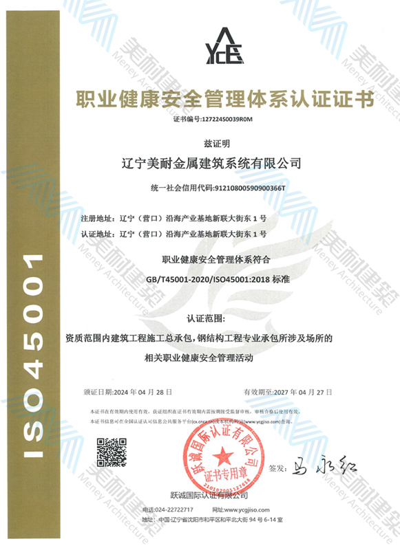 辽宁美耐金属建筑系统有限公司位于辽宁(营口)沿海产业基地,专注于预制金属建筑系统领域,是一家集工业建筑设计、制作、施工及相关的技术咨询与服务为一体的综合性服务企业。作为国家钢结构协会会员、中国建筑金属结构协会会员单位与国家高新技术企业,美耐建筑集建筑工程施工总承包、钢结构工程专业承包等多种资质于一身,并拥有22项钢结构建筑领域专利,9项软件著作权。